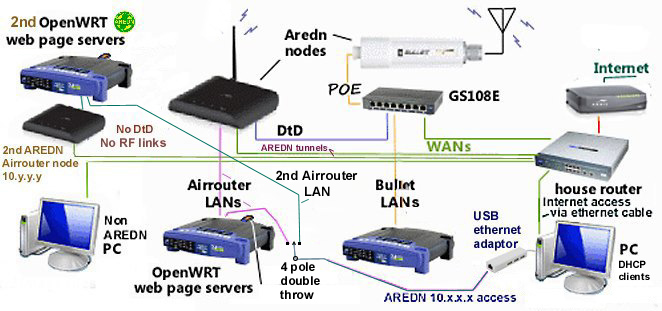 AA7AU mentions: "The way I have access to my LAN/WAN *and* to/thru my Mesh Node is to: - use a normal ethernet cable connection from the house router to the computer's RJ45 jack with normal DHCP from this house router; and, - connect an ethernet cable from my AirRouter/MikroTik/VLAN to my computer using a ethernet-to-USB adapter. (another way to do this is to add in a separate NIC card into your desktop computer with its own RJ45 jack). The AREDN AirRouter gives the PC using DHCP a 10.x.x.x IP address.