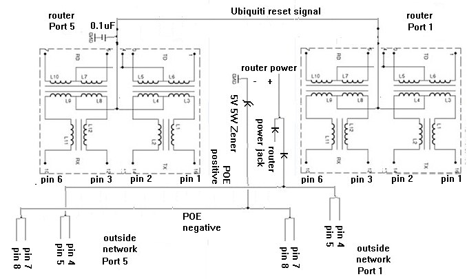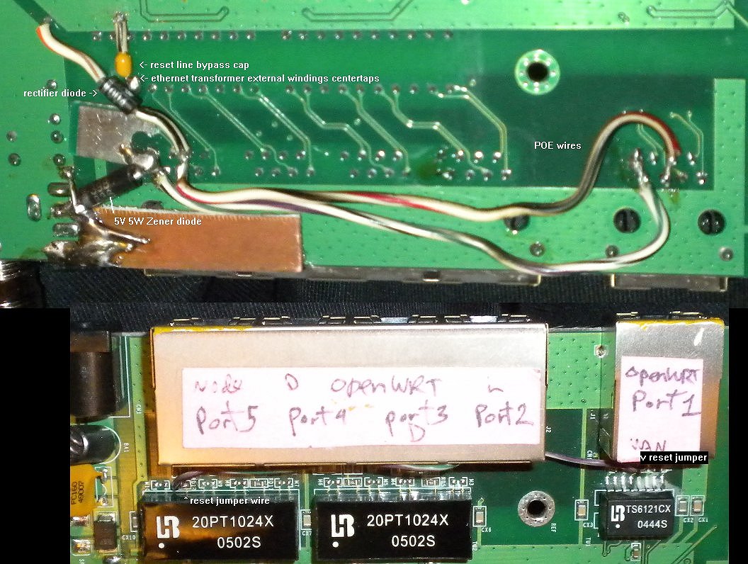 I did an additional mod to it, to have it run off the Ubiquiti POE power supply, and pass the POE to also power the Ubiquiti M900 node. I connected jumper wires between the ethernet jacks that are for the node, and the WAN connection, the blue and brown twisted pairs. Remove 75 ohm resistors RD13 and RD1, as these would introduce an unneeded extra load on the POE. And from the brown jumper wire I connected via a 5V 5W Zener diode to the router's ground, and from the blue jumper (the positive supply) a regular rectifier diode to the router's power rail (the WRT54G V2,2 uses a diode from the power jack to the internal power rail (protection from backwards wall warts, and here it keeps the POE from feeding into any Linksys wall wart that might still be plugged in the router)). As the router's internal DC-DC converters are rated a max of 24VDC, and the Ubiquiti POE brick produces 24VDC, I used these diodes to knock this 24V to 18V inside the router. I didn't want to run the converter chips on the edge... I attached some heat sinking to the Zener diode, on its leads I soldered some pieces of copper clad circuit board, it runs cool. The Ubiquiti POE brick has no problem with the extra load. And this means one less 120V brick in the shack.