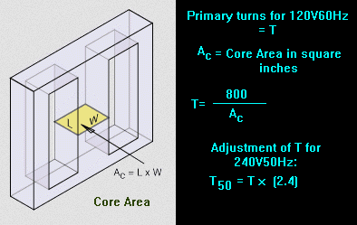 rule of thumb "Number of turns needed for the 120V60Hz primary = 800/(area of the core in square inches)".